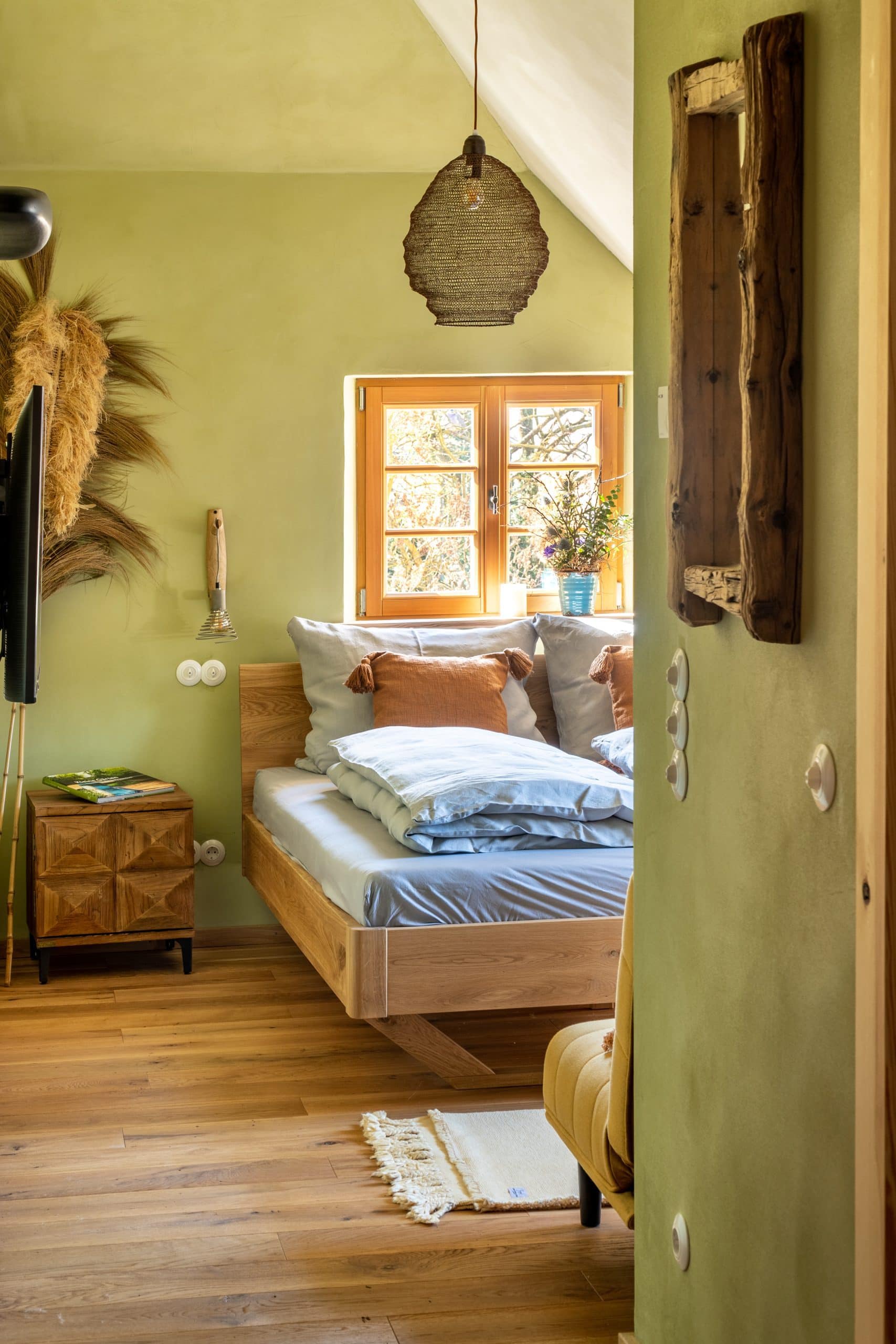 Gemütliches Schlafzimmer mit Naturholzmöbeln und grünen Wänden, ideal für entspanntes Wohnen bei Gut Leben Berlin.