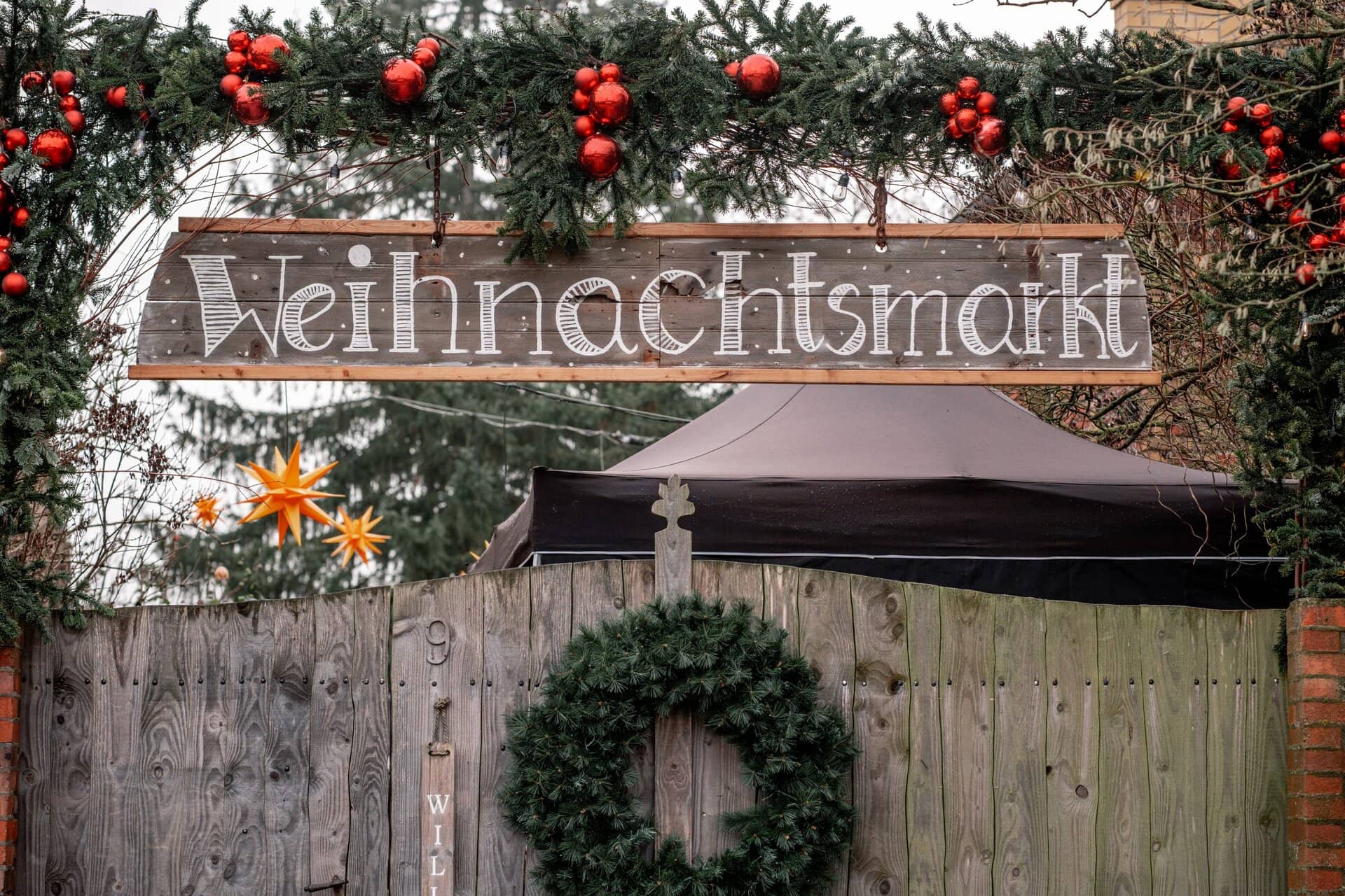 Gemütlicher Weihnachtsmarkt mit Lichterdekoration und Holzschild "Gutes Leben" in Berlin.